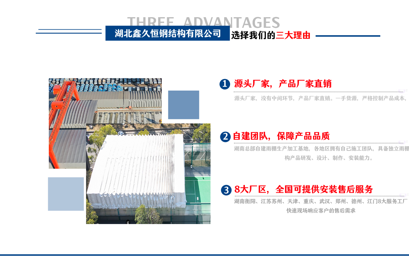 湖北鑫久恒鋼結(jié)構(gòu)有限公司是一家電動雨棚、膜結(jié)構(gòu)車棚研發(fā),生產(chǎn)銷售,施工安裝于一體的專業(yè)鋼結(jié)構(gòu)科技公司,主要產(chǎn)品有伸縮雨棚,電動雨棚,膜結(jié)構(gòu)車棚等。 湖南地區(qū)職員目前有80多人,占地面積20000平方米,廠房面積15600平方米,配備先進(jìn)的生產(chǎn)流水線,使每件品質(zhì)產(chǎn)品的堅實基礎(chǔ)?! 」驹谔K州、天津、重慶、武漢、德州、烏魯木齊、江門均設(shè)有服務(wù)工廠,總?cè)藛T共300多人,擁有專業(yè)的技術(shù)團隊,配備先進(jìn)的設(shè)備和流水線生產(chǎn),產(chǎn)能高,貨源充足,發(fā)貨速度快,服務(wù)區(qū)域廣。 移動伸縮棚適用于通道臨時倉儲、戶外運動遮陽、污水池遮蓋、能源交通、熱力化工、礦山、船舶制造及市政建設(shè)、物流、碼頭等領(lǐng)域的構(gòu)件制作加工,成品半成品存放、倉庫、野外儀器設(shè)備操作用房等。尤其是對工廠發(fā)貨、倉儲臨時遮雨防嗮,梅雨期較長、建設(shè)周期較短的工程施工等特別適用。還可根據(jù)用戶需求量身定制、適合企業(yè)所需不同款式的產(chǎn)品。 我公司堅持“誠信社會為本,客戶滿意為榮”的經(jīng)營理念,做到質(zhì)量把控,嚴(yán)格管理,精益求精,恪守承諾。使鑫久恒逐步走向成熟,其系統(tǒng)化、專業(yè)化日趨完善。以專業(yè)的技術(shù)、科學(xué)的管理,更高的產(chǎn)品質(zhì)量,優(yōu)良的企業(yè)信譽,真誠的客戶服務(wù),靈活多樣的經(jīng)營方式和務(wù)實創(chuàng)新的企業(yè)精神愿與社會各界攜手合作,為推動智能鋼結(jié)構(gòu)建筑事業(yè)的發(fā)展而不斷努力。...